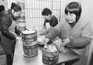 冬季是小笼包子的销售旺季。嵊州市的小笼包行业已让该市3万多人捧上了小笼包饭碗。从上世纪80年代中期开始,该市农民陆续外出经营小笼包,到目前为止,经营的店铺已遍布全国各中小城市,成为该市外出农民自谋职业得益最大的行业。图为昨日嵊州市越秀路这条当地最有名的小吃街上,小笼包子从业人员正在忙着做包子。【来源:天天商报】