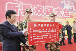 日前,嵊州市司法局负责人向奔赴军营的入伍新兵代表赠送法律援助联络卡。从2008年起,嵊州市司法局在每年欢送新兵时,都向新兵和他们的家属赠送法律援助联络卡,这张小小的法律援助联络卡在4年时间里,已成为该市司法部门服务1000多个入伍军人家庭的法律援助“绿色通道”。【来源:绍兴日报】