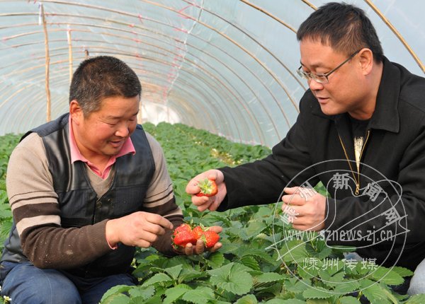 嵊州市绿进农业科技有限公司在台湾微量元素专家王仁泽的技术指导下,研发绿进矿物微量元素,使我市近千亩的桃形李、西瓜、草莓等农作物,通过施用矿物微量元素增加抗病能力而实现了丰产。图为近日王仁泽(右)正在浦口街道向草莓种植大户指导技术。