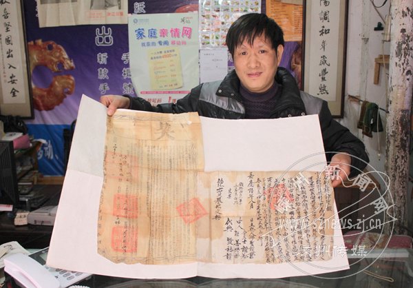 店主徐玉良展示嘉庆间地契文书。