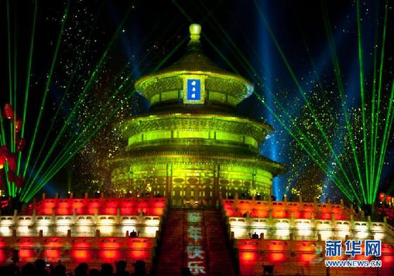 2012年1月1日零时许,灯光在祈年殿上打出“新年快乐”的字样。 2011年12月31日夜,天坛举办新年倒计时庆典活动迎接2012新年的到来。 新华社记者 张宇 摄