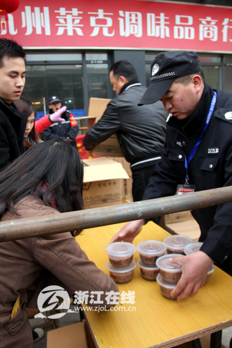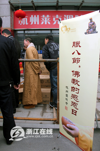 浙江在线还联合杭州金艺旅行社为滨江区肢残人协会,滨江西兴、长河敬老院和下沙杭师院在校的外地师生送去灵隐寺的腊八粥,让他们也能在2012的第一天感受到来自我们的祝福。