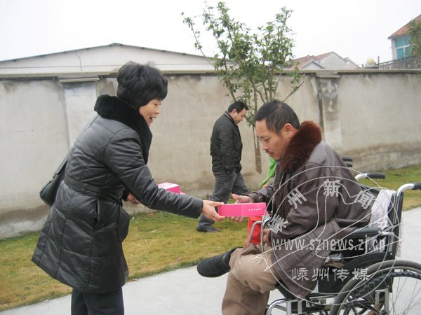 2011年12月31日上午,民建嵊州市基层委员会的爱心志愿者代表募集了1万元爱心款,来到市阳光庇护养老中心看望残障人士,并送上了大米、食用油、毛巾等爱心物资,祝福他们过个快乐的新年。