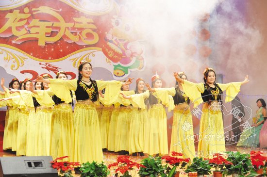 玉兔欢歌辞旧岁,金龙起舞迎新年。元旦前夕,嵊州盛泰纺织有限公司的400多名员工,专程到市职教中心与全校师生开展新春联欢,20多个歌舞、相声、小品等节目让企业员工与学校师生其乐融融。最独特的是来自新疆姑娘的新疆舞《我从新疆来》,16名在盛泰公司工作的新疆姑娘原汁原味的新疆舞让全场观众掌声雷动。图为新疆姑娘的《我从新疆来》。