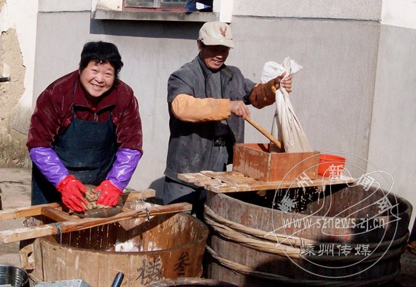 入冬以来,石璜镇沿山一带农民,三五成群上山采掘乌糯根,收入可观。一般每人每天能采掘乌糯根50公斤左右,可加工淀粉4公斤,以每公斤70元计算,每人每天收入可达200多元。图为楼家村村民楼宇钦夫妇俩正在加工乌糯粉。