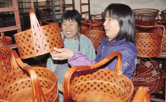 金庭镇下任村工业小区里,市永诚工艺竹编厂的检验人员正在检查出厂竹篮的质量。我市是中国竹编之乡,市内有多家竹编生产企业利用可再生的毛竹资源,手工精心制作环保竹篮,每年投放市场的竹篮在10万只以上,促进了当地毛竹资源的利用与开发,增加了农民收入。