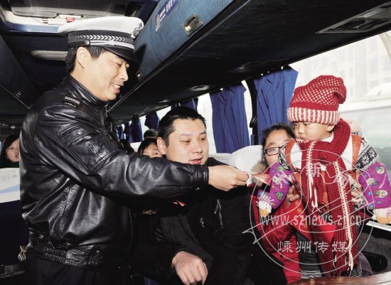 近日,上三高速交警支队二大队的民警在市客运中心对春运班车逐车发放交通安全光盘,并向车内乘客分发“福”字,提醒乘客注意春运安全。