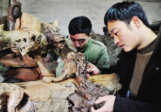 昨日,在嵊州艺术村,根艺美术师在雕刻古沉木“双龙戏珠”。2012年是农历龙年,与龙有关的根雕作品走俏,嵊州艺术村赶制了一批“龙”作品投放市场。据了解,去年嵊州根雕产业产值达亿元以上。【来源:绍兴日报】