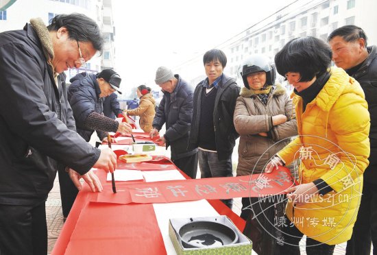 1月11日,由中国农业很行嵊州支行发起,我市多位书法家参与的“现场写春联、送福进万家”活动在甘霖镇举行。据悉,这次活动将在崇仁、三界等地巡回进行,到时书法家们将会免费把现场书写的千幅对联和一万多张喜庆的福字,送给当地居民。图为11日书法家正在书写对联的现场。
