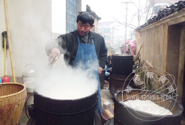 作为一项传统工艺,民间酿酒师走村入户,帮助农民酿出一缸缸美酒,自己也获得一些劳务费。眼看春节将至,这些酿酒师更是忙得不亦乐乎。瞧,这位酿酒师正在三界镇蒋镇村一农户家忙着呢。