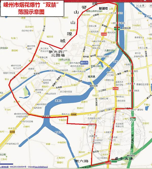 答:我市禁止经营、燃放烟花爆竹的范围为:艇湖塔→城隍山临城山脊线→新光制药厂北围墙→环城公路(罗小线)→城南大桥→环城南路→富豪路延伸南段(规划中)→园二路→官河南路→甬金高速公路→剡兴路→环城南路(兴盛街)→上三高速公路→嵊州宾馆北→艇湖塔以内所辖行政区域(如右图)。