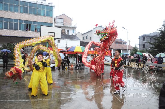 虽然天公不作美,雨越下越大,但是文艺小分队还是兴致很高,少年舞龙队的两条龙时而翻滚,时而腾跃,吸引了不少村民驻足观看,光明村舞蹈队则表演了传统节目“哑背疯”,更是成为当天活动的亮点之一。