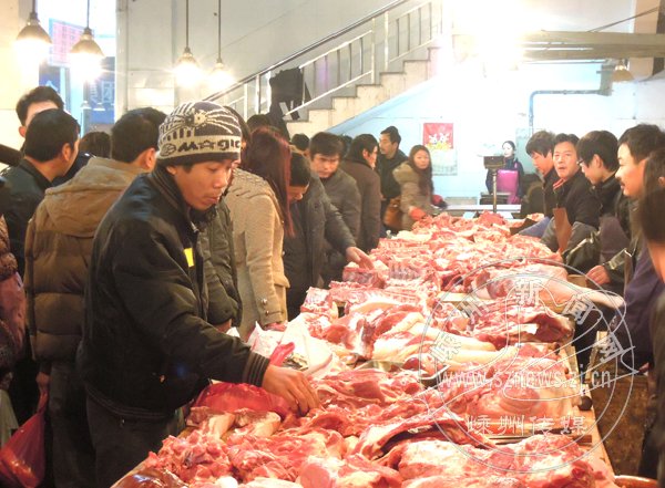 年关将至,菜场供应和销售情况究竟怎样?记者昨日从江滨市场等地了解到,当前市场里蔬菜、肉类、水产等各种农副产品货源充足,品种丰富,销售情况更是十分火热。图为江滨市场一处肉摊前,市民正忙着挑选猪肉。