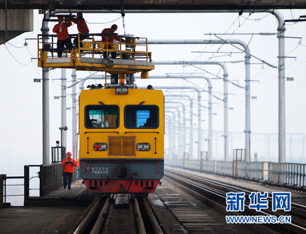 1月24日,施工人员在对京九铁路九江长江大桥上的接触网设备进行检修保养。自1月22日以来,南昌铁路局南昌供电段的职工利用春节期间铁路运输强度相对较小的时机,对京九铁路、昌九城际铁路等电气化接触网关键设备进行全面检修,以迎接节后铁路运输高峰。新华社发(胡国林 摄)