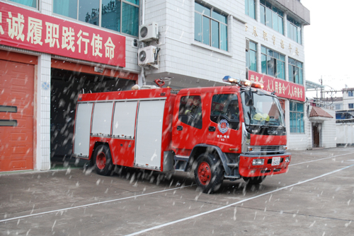 图为除夕,消防官兵冒雪出警。