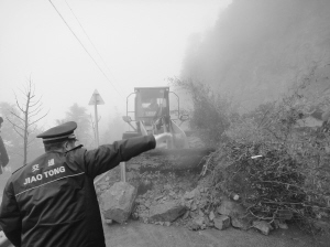 早上8时,工作人员在塌方地段的两端设置了交通安全警示牌。据绍兴县公路管理段平水公路站站长陈明荣介绍,近日来连续降雨和前期的冰雪融化等共同作用,山体出现松动导致坍塌。由于丹家村地段属于山区,公路地势较高,连续弯道较多,路面宽度只有6米,早上的持续大雾,能见度低于20米,这给为抢通道路而进场作业的铲车带来了不便。受塌方影响,绍兴至嵊州岭头山的116路等公交车中断,早上第一趟班车就是行驶到丹家村塌方段受阻被迫返回。其他二级小公交也无法正常通行。在现场,公路段工作人员在塌方段南侧用手工开挖出不到1米的路肩作为临时便道供行人使用,路政人员在维持现场秩序。