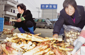嵊州市崇仁镇坑口村的省级雷笋产业示范区依托砻糠覆盖的农业新科技,使村里2000亩核心产笋区获得丰产,村民仅此一项平均增收上万元。图为村民日前包装上市雷笋的现场。【来源:绍兴日报】