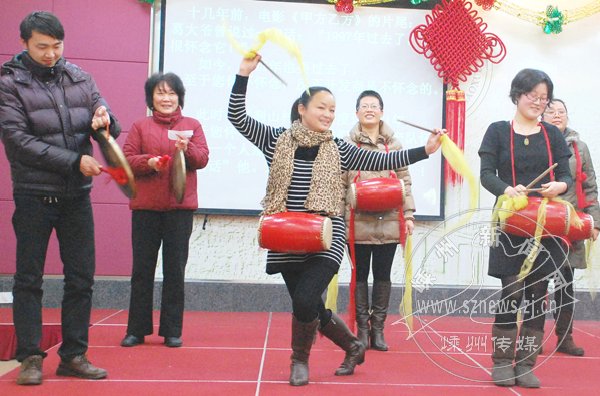 最近,剡山小学举办了一场别开生面的教师迎新春联欢会。在一曲《好日子》的歌声中,校长简要总结了2011年学校的主要教育教学工作与成绩,并向辛勤耕耘、团结奋斗在教育教学一线的教职工表示感谢和新春祝福。接下来是老师们自编自导自演的节目,特别是在《回首2011》节目中,大屏幕上逐一出现了老师们过去一年中工作、生活的照片,有上课的、改作的、辅导孩子的,甚至还有食堂师傅正在挥勺炒菜的,这一切更是勾起了老师们深深的回忆。图为老师们演唱的场景。