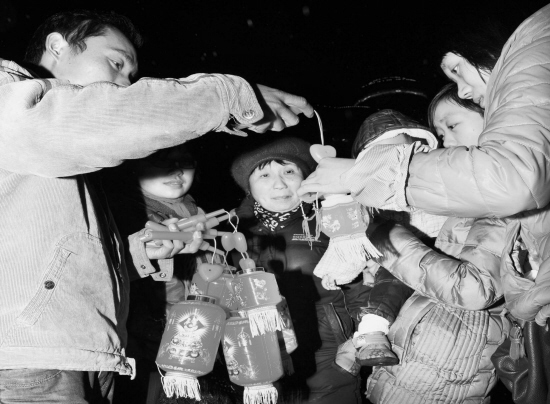 昨晚,嵊州市文化广场举行的灯展上,多位小贩正在销售玲珑诱人、很受小朋友欢迎的迷你龙灯。【来源:天天商报】