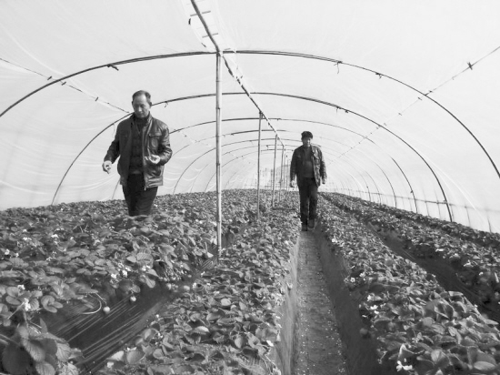 为提升草莓质量、适应市场需求,近年来,该村专门成立了草莓种植研究协会,年年引入新品种,并进行同棚种植比较,从中选取适合本地种植的优良品种进行种植,使果农增收、土地增效。图为种植户在进行同棚品种比较实验。