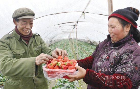 2月10日,从建德来我市创业的老农彭天元夫妻,正在位于甘霖镇的“双棚”草莓田里收获草莓。