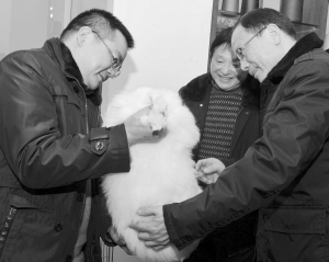 嵊州市畜产品有限公司培育的白中王长毛兔,被誉为“浙江第一兔”。近年来,该公司年供种达20万只,成为我国西部地区扶贫种兔的供种中心。图为日前省农业厅厅长史济锡(右一)一行在嵊州市畜产品有限公司了解“浙江第一兔”的相关情况。【来源:天天商报】