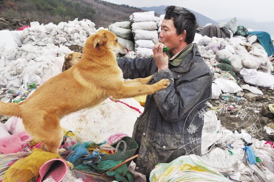 每天中午吃饭前,垃圾场里都会上演这样一场“人狗音乐会”。吹口琴的人名叫田大红,是湖南人,与妻子龚燕子受雇于六夹岙垃圾填埋场分捡垃圾,已7年有余。