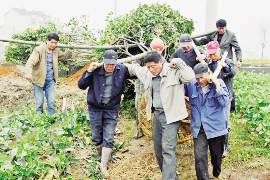 日前,嵊州市黄泽镇一处花木田里,多位农民正在移栽一棵桂花树。