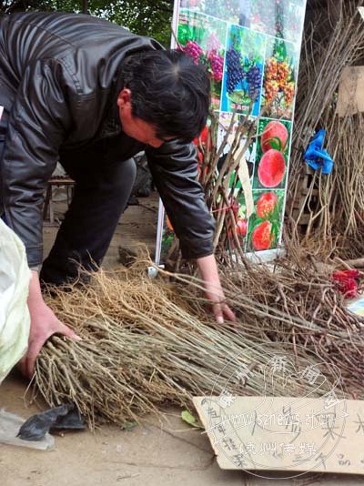 山东省临沂市农民刘某把塑料人参果PS在梨树的树干上,以此作为宣传图片,宣称是可挂果的人参树苗(实质是木槿),在我市花鸟市场出售时,被市民当场识破。
