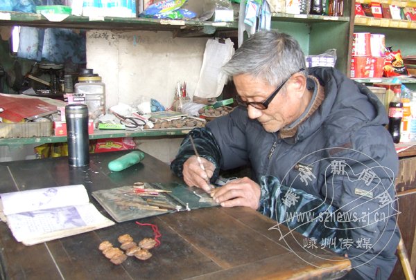 在长乐镇福全村上王庄自然村路边的一家小卖部里,每天都会看到一位头发花白、戴着老花镜伏案雕刻桃核的老人,偶尔孙女静静地在旁边观看,老人便会为她讲嫦娥奔月、孙悟空大闹天宫的故事。日前,记者见到了这位核雕爱好者,他就是钱正明。