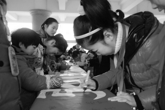 3月5日是毛泽东题词“向雷锋同志学习”49周年,为弘扬无私奉献的雷锋精神,鹿山小学于当日上午举行了“弘扬雷锋精神”签名仪式。图为学生签名的场景。