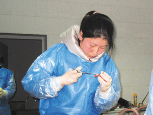 前辈话音刚落,朱茵已穿上工作服,戴好口罩、手套,她神情专注,像换了个人似的。“死者断了六根肋骨,而不是五根;他颈部缩痕是条缢痕,而不是勒痕……”从尸体的内脏到后背,朱茵摸了好几遍,最后她很肯定地得出结论。天很冷,她额头沁出了细微汗水。笔者不禁问她:“你真的把手伸到尸体体内去找?”她说:“是啊,戴着手套的。”
