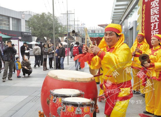 3月17日,我市省级非物质文化遗产的长乐吹打,在上海市浦东区大姆指广场进行“嵊州市旅游进社区”活动,向近万名上海市和海外游客进行展示和推介。图为活动现场。