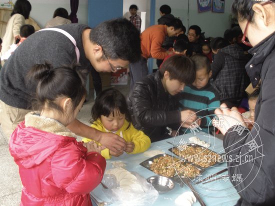 3月16日,罗星幼儿园的老师、幼儿、家长代表共90人赴下王镇中心幼儿园献爱心,为下王的小朋友们送去了羊角球、风火轮、跳跳车等价值7000元的礼物,两园的小朋友还进行了手拉手结对联谊活动,并自己动手包饺子,一起享用了快乐的午餐。图为在家长们的指导下,罗星和下王的小朋友正在津津有味地包饺子。
