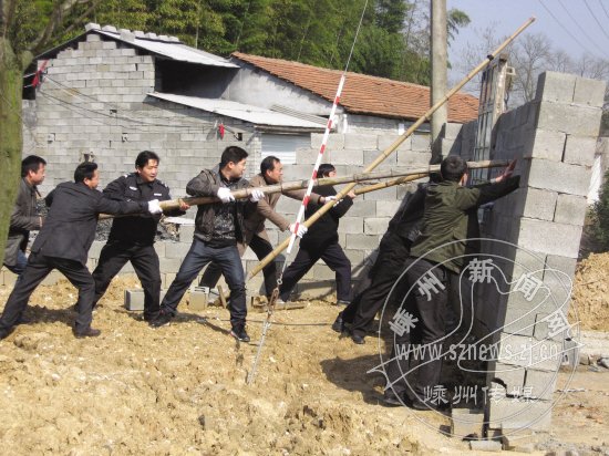 3月14日,三界镇政府城建办、综治办、国土所联合对三界镇清水塘村寺下自然村一违法建筑进行强制拆除。