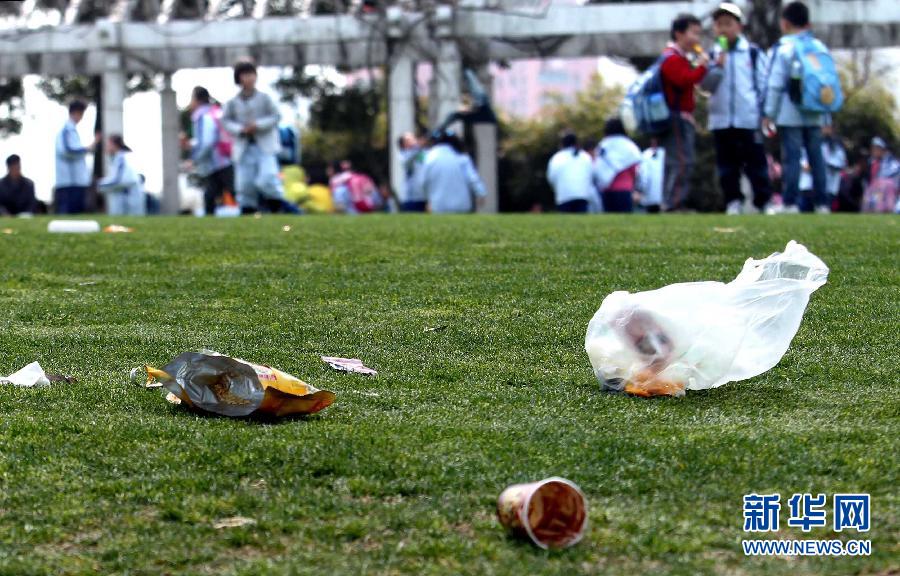 3月22日,上海植物园草坪上散落的食品包装袋。 当日,记者在上海植物园内看到,多所中小学的学生在此组织集体春游。学生们野餐后,尽管大部分学校的老师都组织学生将食品包装袋、饮料罐等进行统一收集处理,但仍有不少的垃圾散落在草坪上。在感受大好春光的同时,部分学校和老师也应加强对学生游园文明礼仪的教育。 新华社记者刘颖摄