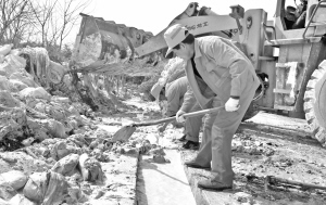 昨天上午,嵊州市公路管理段组织路政施工人员,对嵊州市路田岭一处公路弯道边阻碍通行的30吨废弃氧化钙进行清理。这批氧化钙是日前一辆大货车侧翻时留下的,成为废弃物。图为路政施工人员正在清理作业。 【来源:绍兴晚报】