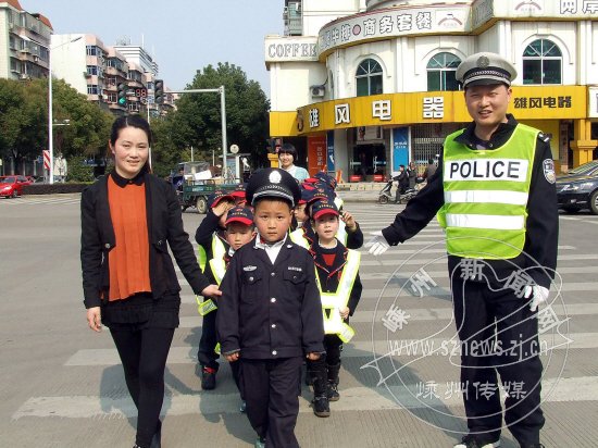 头戴交警帽,身着交警服,3月22日下午,飞天艺术幼儿园的小朋友们在老师和交警的指导下,学习辨识交通指示灯,走斑马线。让小朋友们在实践中学习交通安全知识,并引导更多人遵守交通规则,从3月19日开始,该园的每位小朋友都体验了这样的安全教育课。