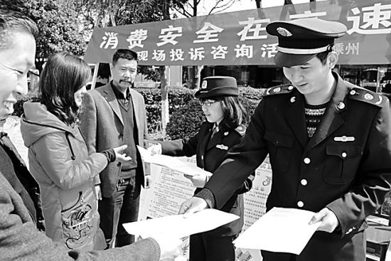 近日,浙江省嵊州市工商局、市消费者权益保护委员会联合有关单位在上三线高速公路嵊州服务区开展了“消费安全”进高速现场投诉咨询服务活动。活动现场设置了实物展台、展板宣传、资料发放、咨询服务和现场受理投诉等多个功能区,受到过往旅客的欢迎。工作人员详细讲解了识假辨假知识、食品选购方法、消费维权途径以及相关的法律法规。图为工作人员在分发宣传资料。