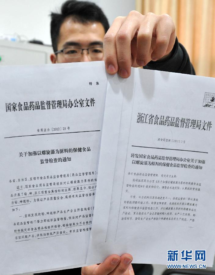 图为国家食品药品监督管理局办公室2月29日下发的“关于加强以螺旋藻为原料的保健食品监督检查的通知”和浙江省食品药品监督管理局3月2日下发给省内各市的转发通知(3月30日摄)。