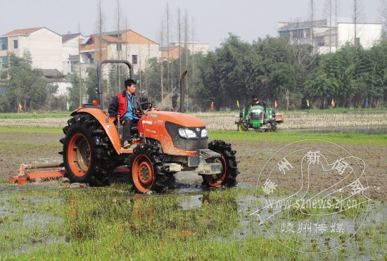 当前正是春耕春种时节,连日来,我市1000多台各式耕作机械奔忙在田头。据悉,今年全市早稻种植面积为2.6万亩,为提高耕作效率,不少粮食生产合作社和种粮大户采用机械耕作。图为崇仁镇赵马田头的耕作场面。