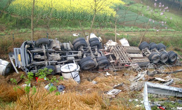 昨日上午6时25分左右,甬金高速公路宁波方向黄泽出口的匝道上,一辆江西牌照的半挂大货车在撞坏了一段40多米长的钢质波形护栏后,翻下了10多米高的路基,造成两人死亡一人受伤。
