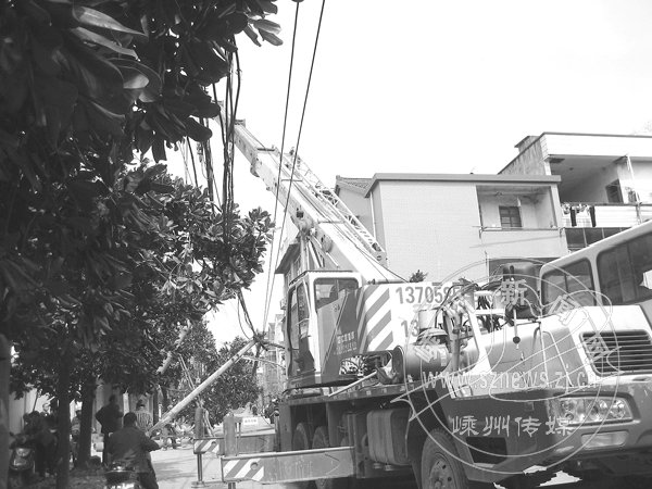 4月2日上午7点半左右,东豪新村附近发生惊险一幕,一辆满载面粉的大卡车在停车时由于刹车不佳发生溜坡,撞倒一根电线杆,造成电线线路损坏。电力部门接到报警后,立即赶到现场进行维修。据了解,经过8个小时紧急抢修,到下午3点左右,电力工人终于使该路段电力得到了恢复。图为电力工人抢修现场。