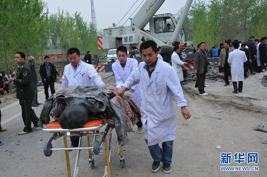 4月12日,医护人员在车祸事故现场救援。当日清晨6时30分左右,安徽宿州所辖萧县境内311国道王寨镇附近发生一起中巴客车与大货车相撞事故,目前已造成至少23人丧生。救援人员正使用大型吊装设备清理现场,并继续搜寻尚未发现的乘客,受伤人员已被送往附近医院救治。新华社发(郭亚 摄)