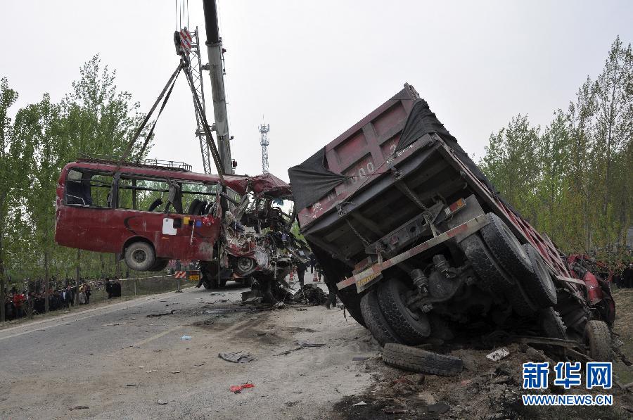 4月12日,救援人员在清理车祸事故现场。当日清晨6时30分左右,安徽宿州所辖萧县境内311国道王寨镇附近发生一起中巴客车与大货车相撞事故,目前已造成至少23人丧生。救援人员正使用大型吊装设备清理现场,并继续搜寻尚未发现的乘客,受伤人员已被送往附近医院救治。新华社发(郭亚 摄)