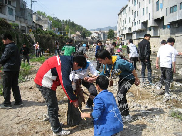 4月6日下午,为配合清洁家园活动,北漳镇组织志愿者在集市场旁的河道上清理垃圾,经过2个多小时的清理,终于将河道上的垃圾清理干净。图为志愿者正在清理垃圾的场景。