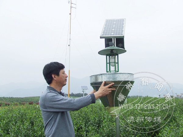 近日,市气象局协同有关部门“进村入企”,为黄泽明山茶场茶园中心区提供“保姆式”气象服务,投资数万元,建起太阳能气象站,为茶农在第一时间准确知晓当地气象、做好茶叶科学管理提供了方便,成为茶农丰收的“保护伞”。图为技术人员正在使用太阳能诱虫器,后面就是太阳能气象站。