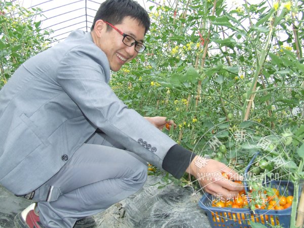 近日,我市三新技术实验园区从台湾引进种植的“金珠番茄”上市了,市价约20元一公斤,虽有点贵,但销量不错。图为工作人员正在采摘番茄。