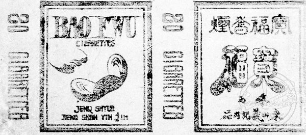 民国初期,嵊县开始经销外国机制卷烟;抗日战争爆发后,货运中断加之苛捐杂税、关卡层层,境内机制卷烟近乎绝迹,地方手工卷烟兴起。手工卷烟具有设备工艺简单、投资少、周转灵、消费量大等特点,一时风靡全县,大小手工烟社林立。直到日寇投降后,才恢复机制卷烟的供应,地方手工卷烟复趋萎缩。这枚“宝福”牌烟标,由嵊县嵊西东山义记手工烟社出品,手工雕板印刷,画面为元宝和蝙蝠图案,谐音“宝福”,有财源广进、福寿吉祥之意。东山,原属嵊西桃源乡,今属甘霖。此枚烟标是嵊县烟草发展史的实物见证。