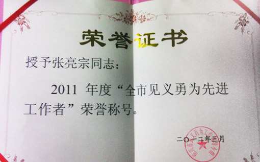 4月25日,本网通讯员张亮宗荣获2011年度绍兴市见义勇为先进工作者荣誉称号。